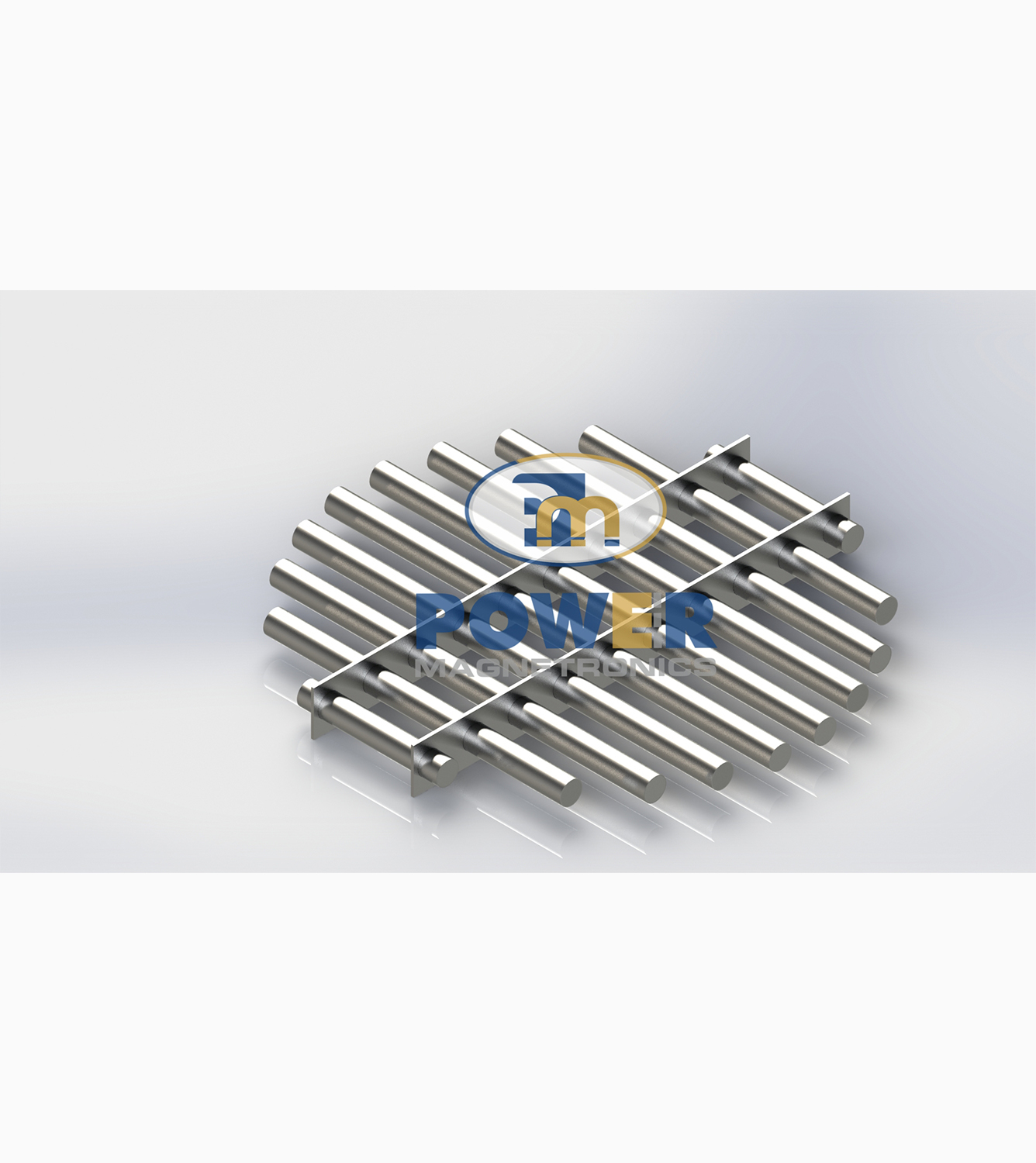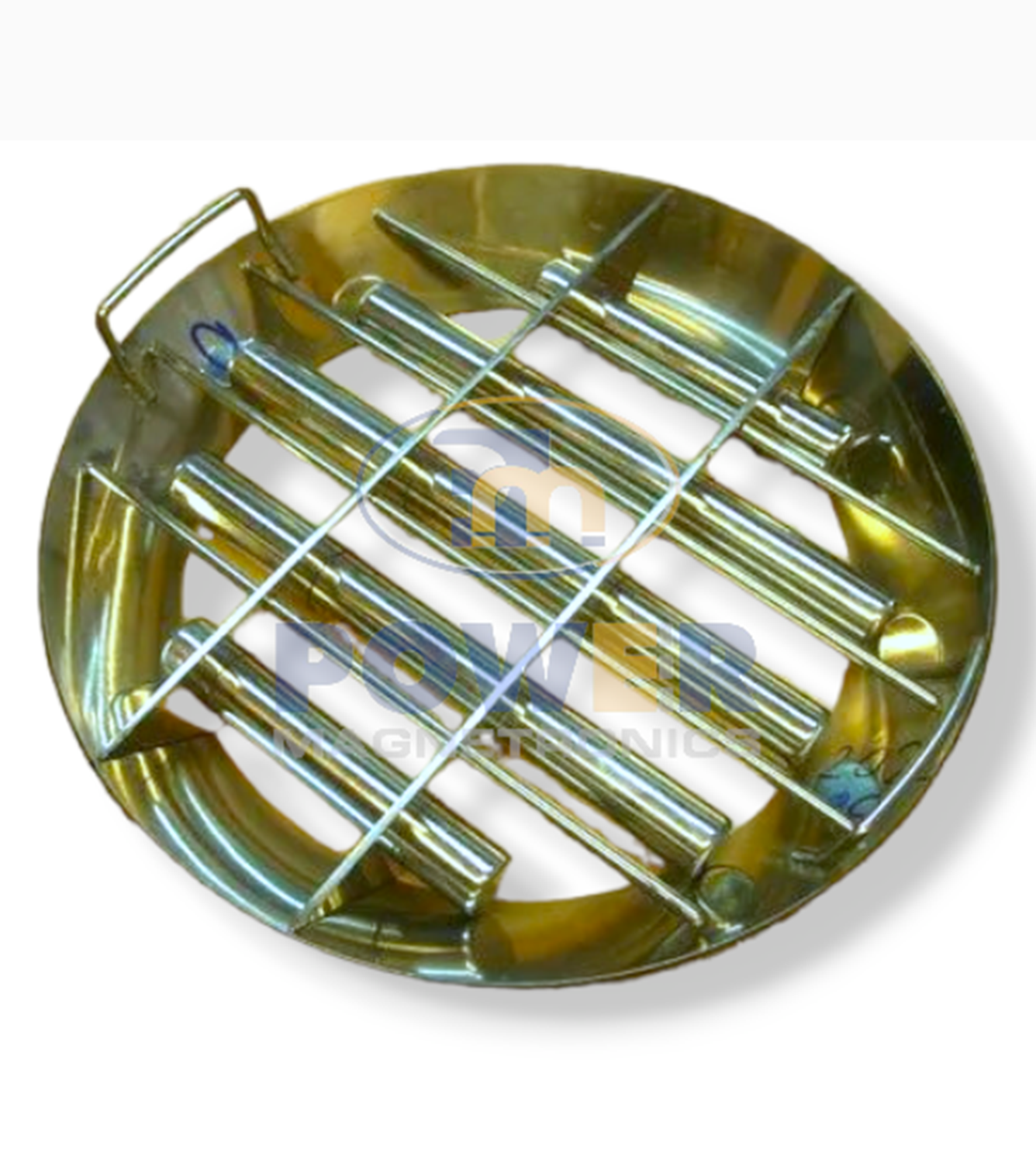Grill magnet is made up of magnetic elements which are fitted inside a frame. The magnetic elements are made up of hard ferrite magnets or High-intensity rare earth magnets. All the components are made up of Stainless Steel 304/316 material. Permanent Magnetic Grills are used for separation of iron particles mixed with dry, granular, or free-flowing material. Grill magnet is made by using stainless steel frames (Round, Square or Rectangular) with magnetic rods inside the frame. Grill magnet is efficiently utilized if contamination is within 1% to 1.5% by weight. For higher levels of contamination, drawer magnet should be used. We can manufacture magnetic grill into three power variant namely:
