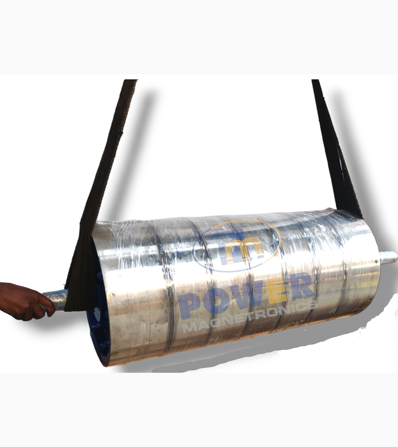 Power Magnetronics make magnetic drum pulley operates as head pulley on belt conveyors. It is specially designed for removing both large and small pieces of iron contaminants from product streams. It is powerful enough to remove tramp iron from heavy flows of bulk materials including bulk and abrasive material. These low cost, self-cleaning magnets remove tramp iron and purify materials conveyed in bulk forms. When Material carried on conveyor enters the magnetic field surrounding the magnetic drum pulley, pieces of ferrous metal in the material are attached to the belt. They are held magnetically against the belt until carried to the other side of the pulley, where the belts take them away from the magnetic field to be discharged. Non-magnetic material falls away from the pulley in normal operation. This cycle of separation is continuous and automatically working.
