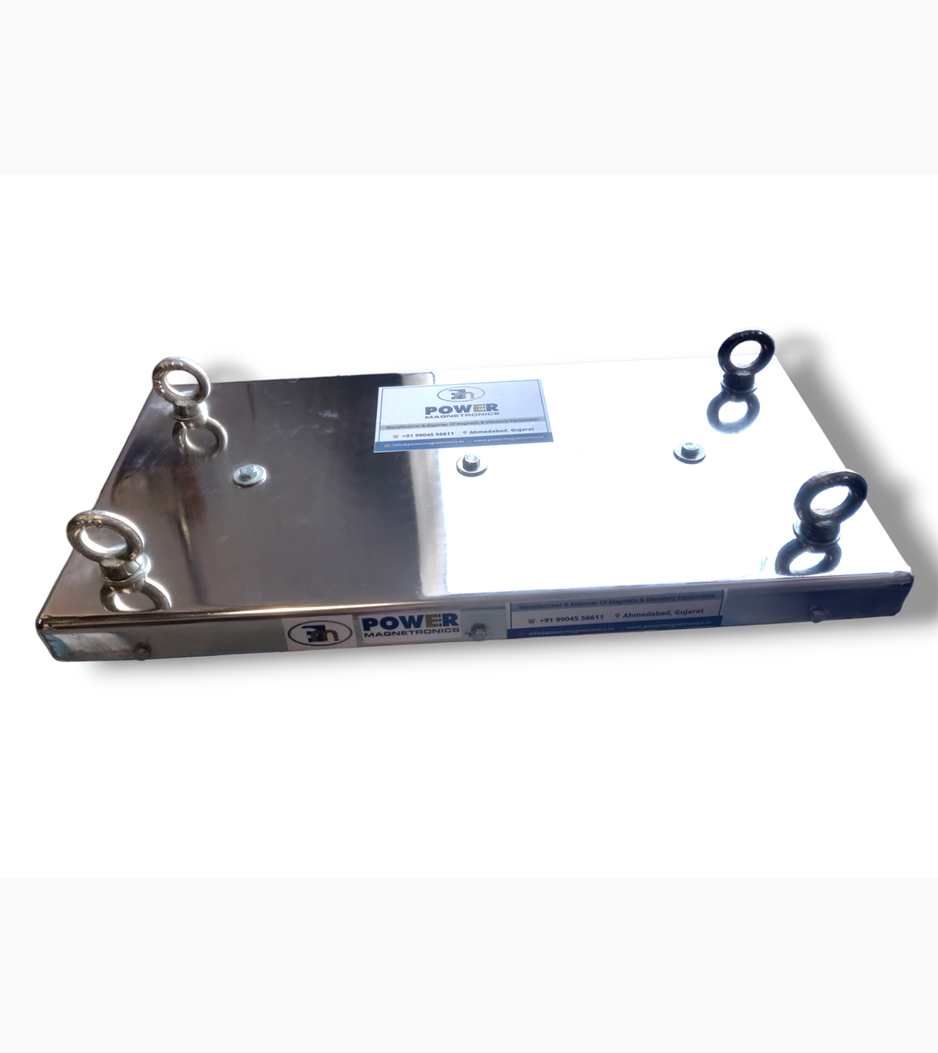 Power Magnetronics make plate magnets are an inexpensive form of magnetic protection against occasional tramp iron contamination. Plate magnets can be used in a wide range of industries and are commonly installed within a chute or over a conveyor. Plate magnet is constructed from stainless steel, which utilizes projected magnetic stainless steel poles for an enhanced field intensity. Stainless steel pole areas maximize the holding power of the magnets. Plate Magnets are designed to divert the product stream away from the magnet surface while allowing tramp metal to be magnetically attracted to the magnet’s surface behind the collection steps. Plate Magnets are easily installed and are supplied complete with sanitary hinges, latches, and mounting hardware. The hinged mounting design permits quick, easy cleaning of the magnet surface.