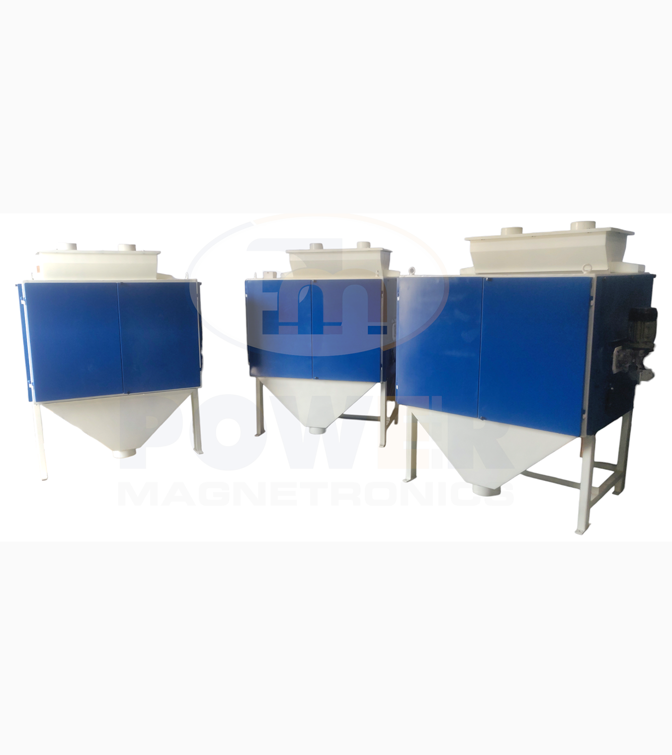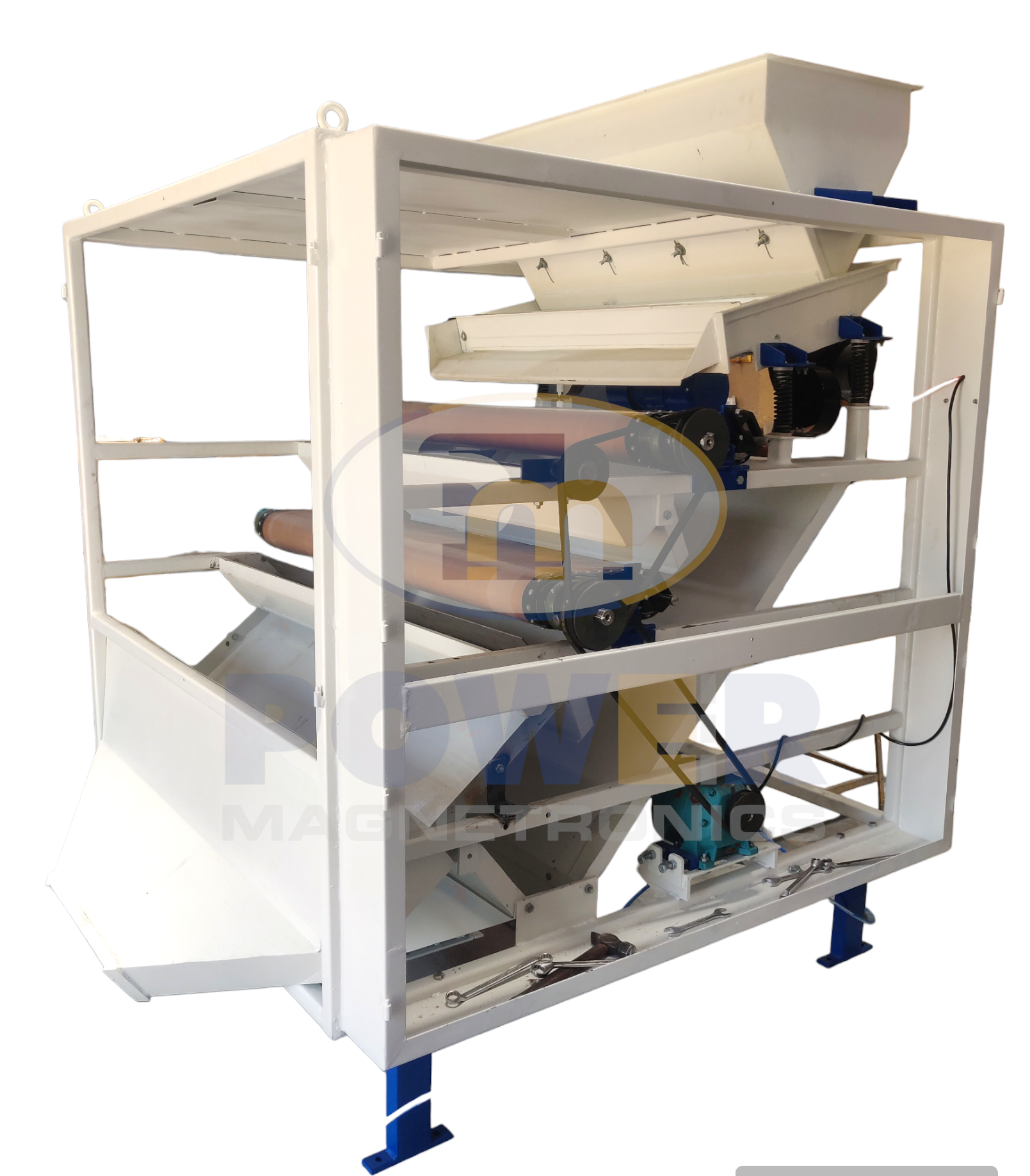 Power Magnetronics make roller type magnetic separator has two rolls of which one does not contain magnets whereas the other has a magnet embedded in the roll. The two rolls are wrapped by belts over which the feeds travel for separation. Upon crossing over the magnetic roll, all the magnetic substances stick to it till they are relieved from the magnetic field. Non-magnetic substances fall freely from the magnetic roll separator whereas those reacting to the magnetic field fall further away. If multiple rolls are installed separation takes place at each level and a purely magnetic output is achieved.